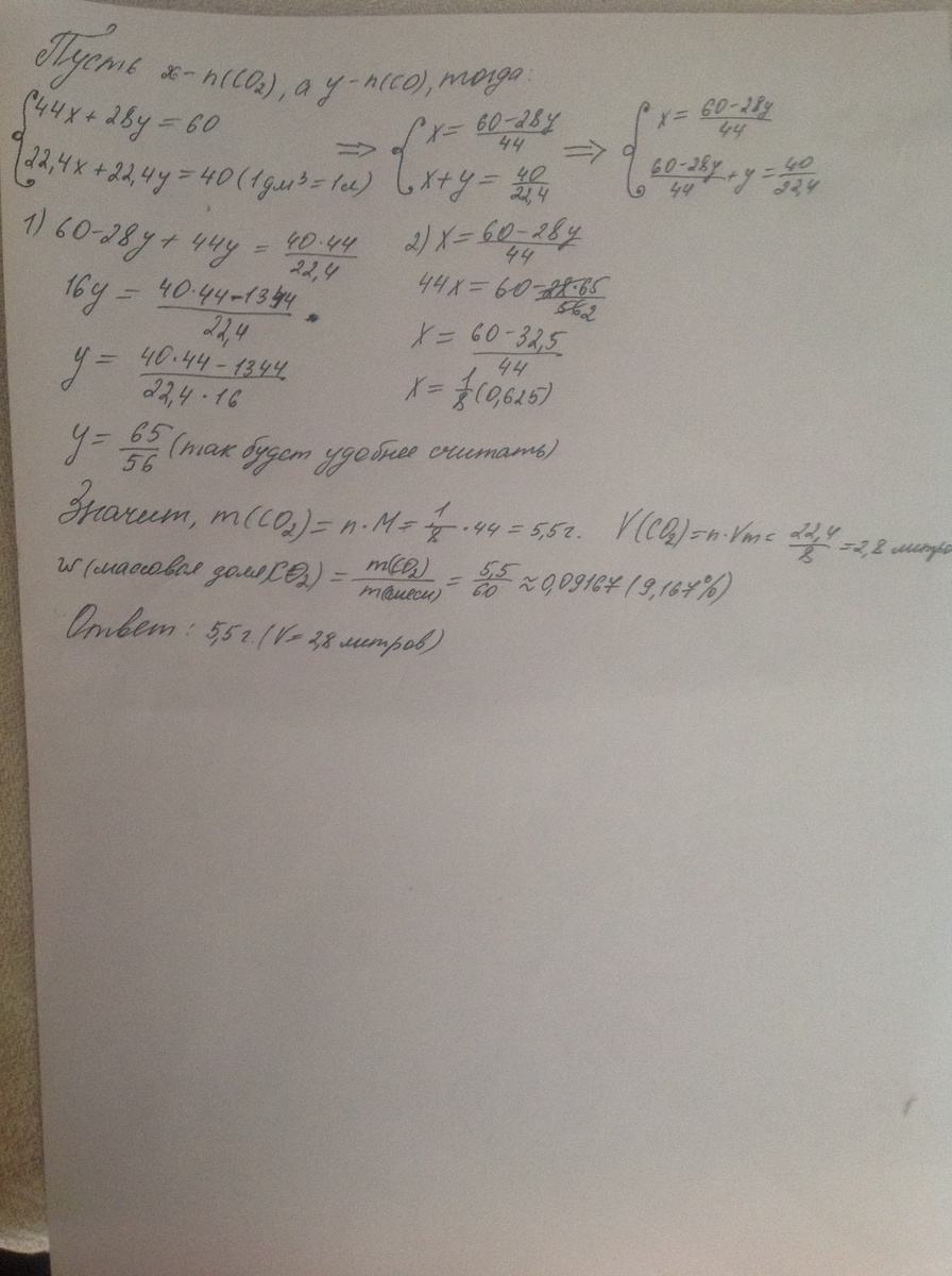 Масса 40 дм^3 газовой смеси, состоящий из СО2 и СО, равна 60 г. Рассчитайте массу СО2 в этой смеси.