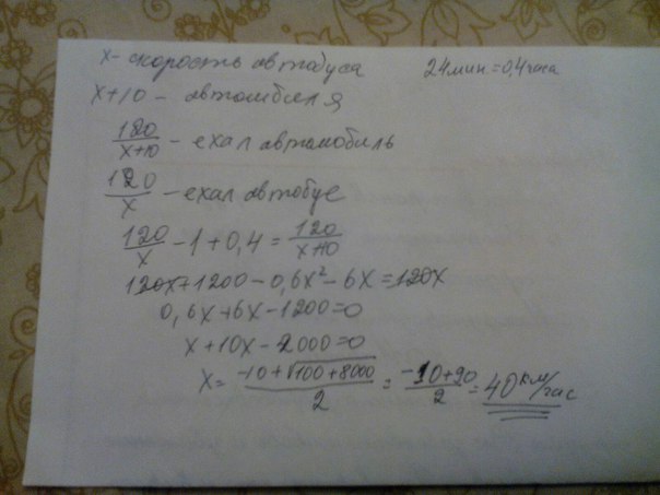 Расстояние от города до посёлка равно 120 км. Из города в посёлок выехал автобус. Через час после этого вслед за ним выехал автомобиль, скорость которого на 10 км/ч больше скорости автобуса. Найдите скорость автобуса (в км/ч), если известно, что в пути он сделал остановку на 24 минуты, а в поселок автомобиль и автобус прибыли одновременно. ПОМОГИТЕ ПОЖАЛУЙСТА РЕШИТЬ И РЕШЕНИЕ ДОЛЖНО БЫТЬ ПОДРОБНЫМ, ЧТОБЫ Я МОГЛА ПОНЯТЬ КАК ТАКИЕ ЗАДАЧИ РЕШАТЬ!!!!!