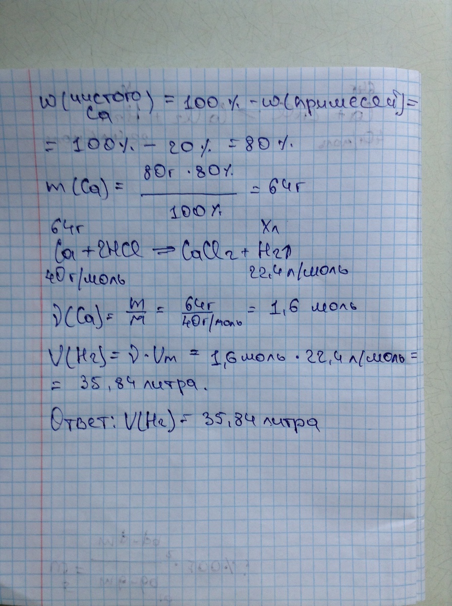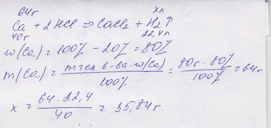какой объём водорода образуется при взаимодействии 80 г кальция, содержащего 20 % примесей, с необходимым количеством соляной кислоты