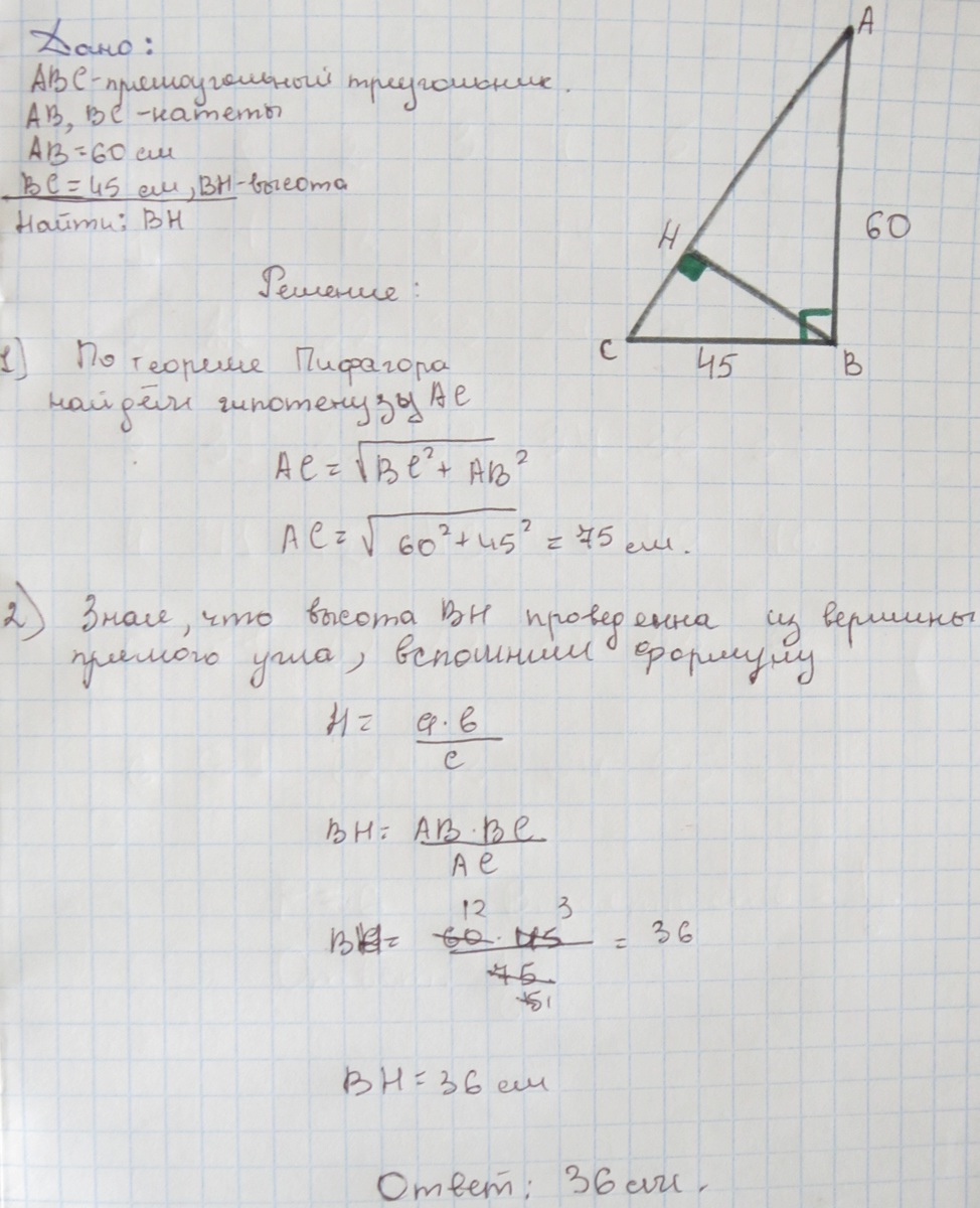 В прямоугольном треугольнике длина катетов равны 45 и 60 см. Найдите длину и высоту веденой к гипотенузе треугольника