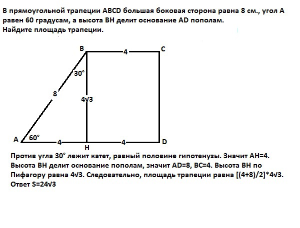 В прямоугольной трапеции ABCD большая боковая сторона равна 8 см., угол A равен 60 градусам, а высота BH делит основание AD пополам. Найдите площадь