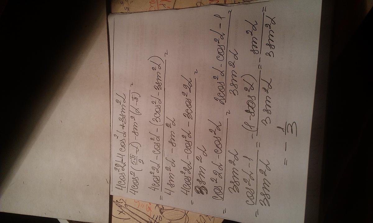 [tex]\frac{4cos^{2}\alpha-4cos^2\alpha+3sin^2\alpha}{4cos^2(\frac{5Pi}{2}-\alpha)-sin^{2}2(\alpha-Pi)}[/tex]