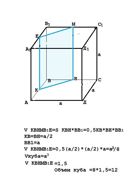 Объём треугольной призмы отсекает от куба плоскостью проходящей через середины двух рёбер, выходящей из одной вершины и паралельно третьему ребру, выходящему из этой же вершины=1,5. Найти объём куба.