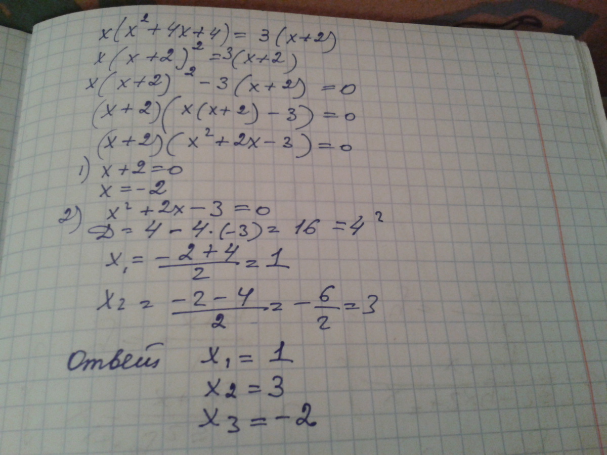 Подскажите пожалуйста,как пошагово решить вот это уравнение: x(x^2+4x+4)=3(x+2).
