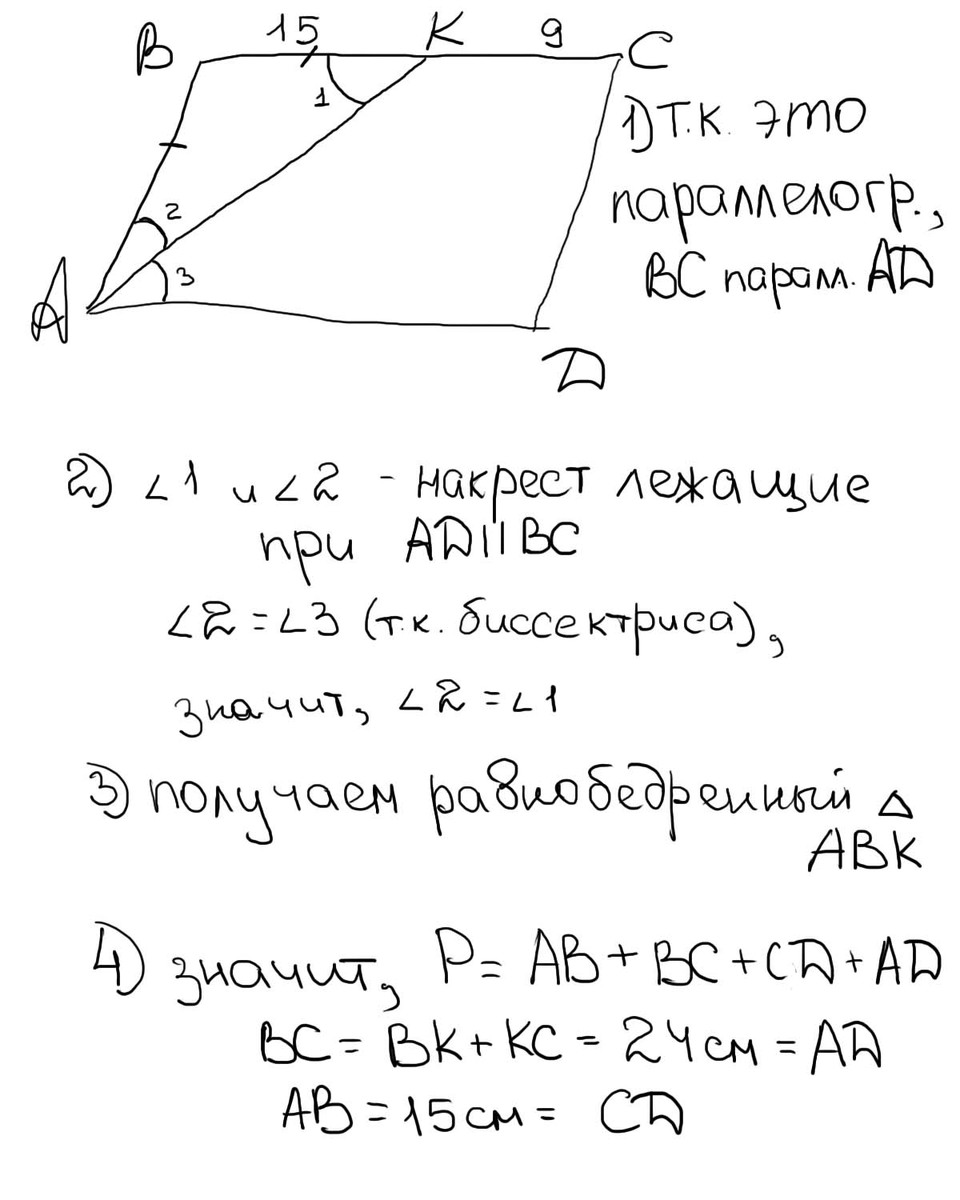 Биссектриса угла А параллелограмма АБСД пересекает сторону ВС в точке К. Найдите периметр параллелограмма если ВК=15см КС=9см