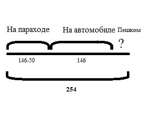 3. Турист проехал на автомобиле 146 км,на пароходе на 50 км меньше, чем на автомобиле , а оставшийся путь прошёл пешком.Весь его путь составил 254 км.Сколько километров турист шел пешком?