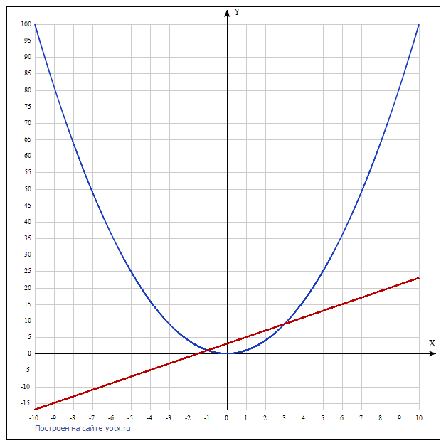 Графики пересекаются в двух точках (-1; 1) и (3; 9).