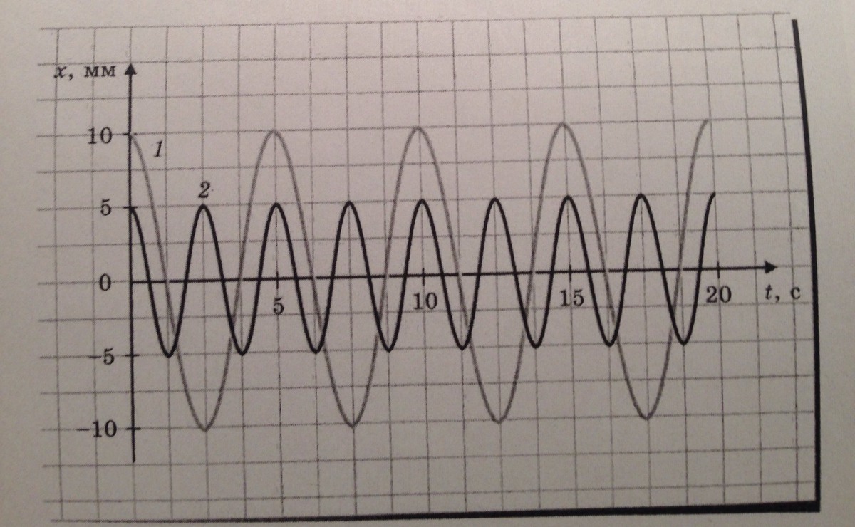 На рисунке изображены графики зависимости смещения от времени для двух колеблющихся тел - 1 и 2. Чему равны амплитуды, периоды и частоты колебаний этих тел?