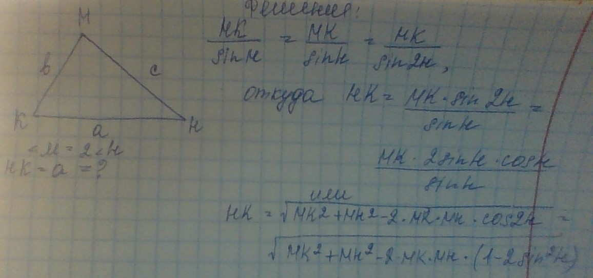 В треугольнике МНК угол М в два раза больше угла Н. МК=в, МН=с.