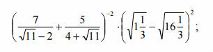 1)[7/(√11-2)+5/(4+√11)]^-2={7(√11+2)/(11-4)+5(4-√11)/(16-11)]^-2=