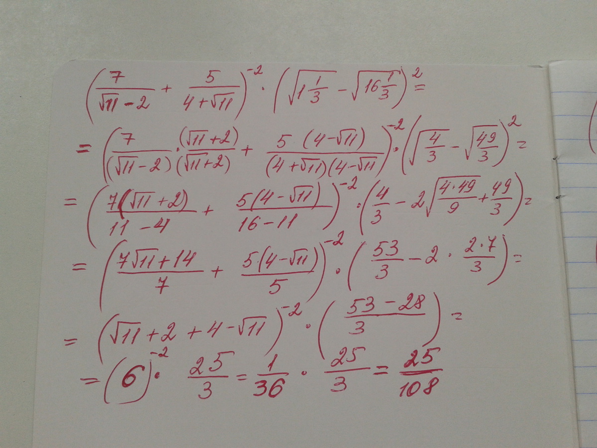 =[7(√11+2)/7+5(4-√11)/5]^-2=(√11+2+4-√11)^-2=(6)^-2=1/36