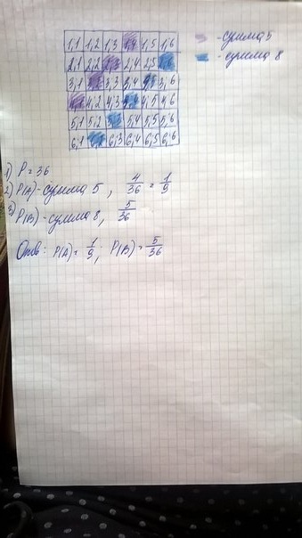 Событию "выпадает в сумме 5 или 8" удовлетворяют 9 исходов.