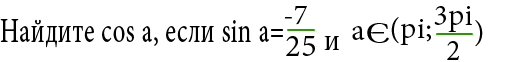 cos(a) = - sqrt(1 - sin^2(a)) = - sqrt(1 - 49\625) = - 24\25