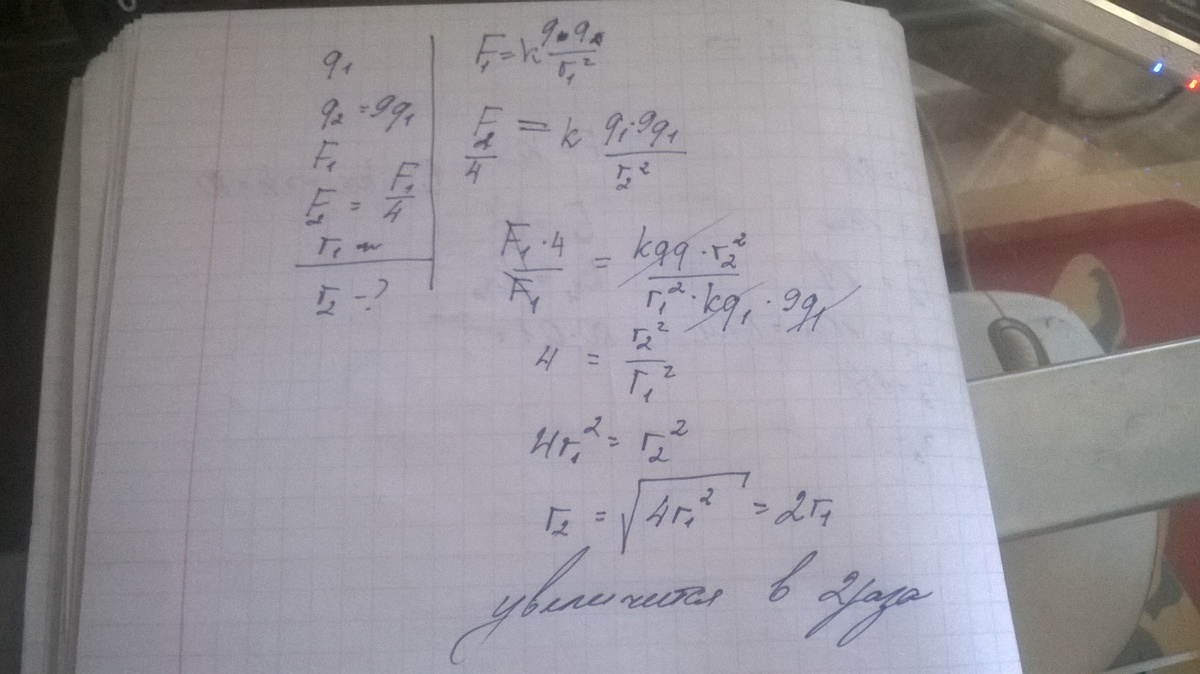 Во сколько раз надо изменить расстояние между зарядами при увеличении одного из них в 9 раз, чтобы сила взаимодействия уменьшилась в 4 раза?