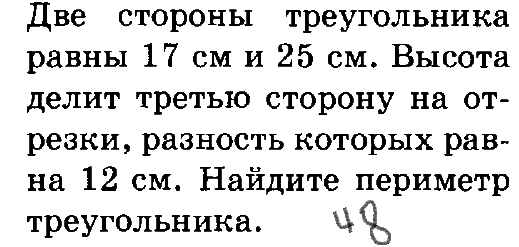 Две стороны треугольника равны 17 и 25. Высота делит третью сторону на отрезки, разность которых равна 12 см. Найдите периметр треугольника.