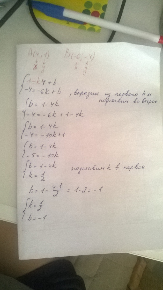 Прямая у=kх+b проходит через точки А(4;1) и B(-6;-4) Найдите значение параметров k и b.Помогите решить и объяснить на фото