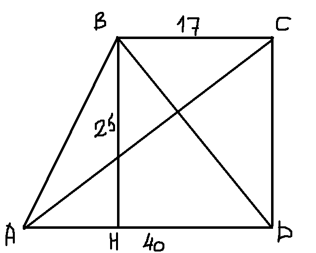 В прямоугольной трапеции ABCD основания равны 17 дм и 40 дм, а высота CD равна 25 дм. Найдите сумму диагоналей трапеции.