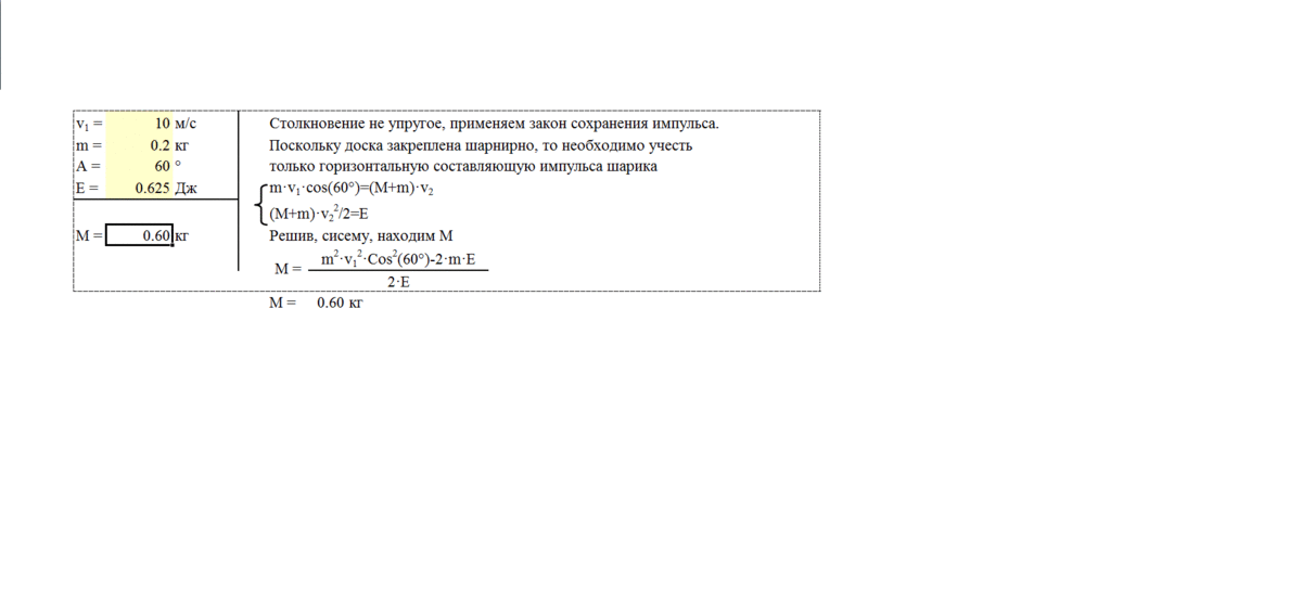 Массивная доска шарнирно подвешена к потолку на лёгком стержне. На доску со скоростью 10 м/с налетает пластилиновый шарик массой 0,2 кг и прилипает к ней. Скорость шарика перед ударом направлена под углом 60° к нормали к доске (см. рисунок). Кинетическая энергия системы тел после соударения равна 0,625 Дж. Чему равна масса доски?