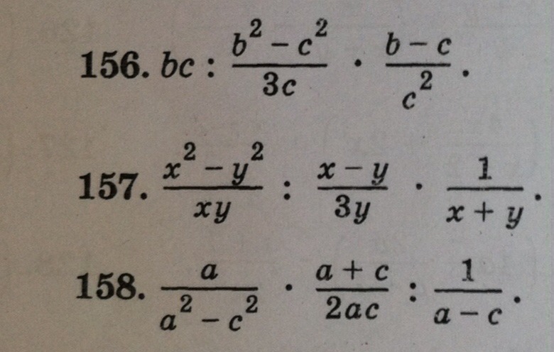 156)  frac{bc*3c*(b-c)}{(b+c)(b-c)*c^2}= frac{3b}{b+c} \ 157)  frac{(x+y)*(x-y)*3y*1}{xy*(x-y)*(x+y)}  =  frac{3}{x} \ 158)  frac{a*(a+c)*(a-c)}{(a+c)*(a-c)*2ac*1}=  frac{1}{2c}