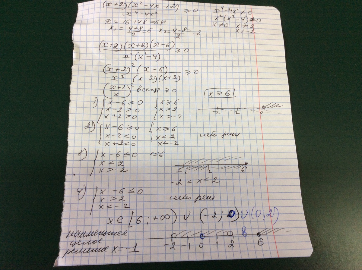 (x+2)(x^2-4x-12)/(x^4-4x^2)>=0 (больше-равно нулю)