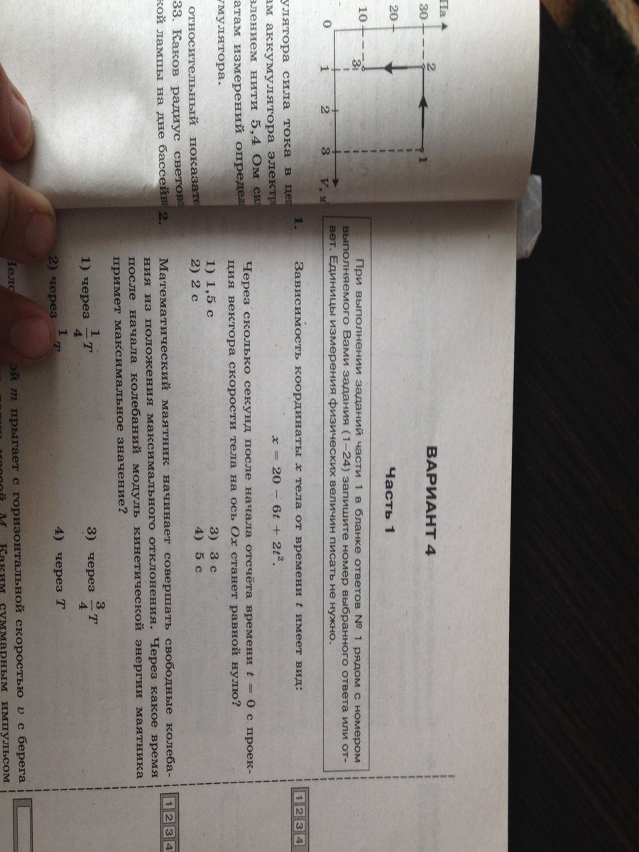 Сначала найдём уравнение скорости. Скорость -это первая производная от координаты по времени, поэтому V=x' =(20-6t+2t²)' = 0-6+4t =-6+4t.