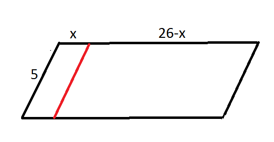 Стороны параллелограмма равны 5 и 26. Прямая, параллельна одной стороне параллелограмма, разбивает его на два неравных подобных параллелограмма. Найдите длины сторон этих параллелограммов.