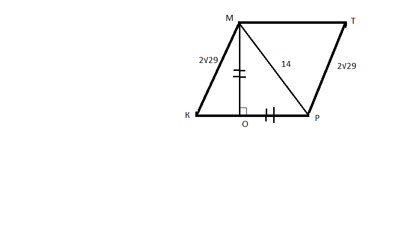 Диагональ MP параллелограмма КМТР составляет с его высотой МО угол 45 градусов и равна 14 м. Боковая сторона параллелограмма равна 2√29 м. Найдите площадь параллелограмма.