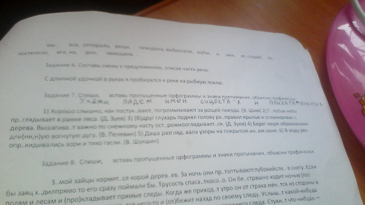 Хорошо слышно ,как постукивают ,погромыхивают за рощей поезда. Голубое небо приглядывает в рамке леса. Вдруг глухарь поднял голову,расправил крылья и спланировал с дерева (я увидела,только то что там написано спланировал) . Вышагивает важно по снежному насту ,осторожно оглядывается (раздельно) .Берег моря образовал длинную вогнутую дугу. Даша разглядывала узоры на покрытом инеем окне. В воду рек опрокидывались зори и тихо гасли.