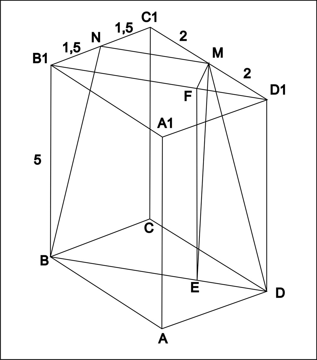 Из треугольников BNB1 и MED по т.Пифагора найти DM и BN. Они соответственно равны DM=√29, BN=√27,25. MN - средняя линия треугольника B1C1D1 и равна половине B1D1. Отрезок КЕ=MN=2,5 Отрезок ВК обозначить х, ЕD=( 2,5-x), т.к. ВК+ЕD= BD-2,5. Из каждого треугольника выразить квадрат высоты и приравнять. Найти ВК, и по т.Пифагора найти высоту.
