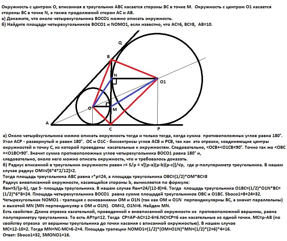 площадь треугольника О1ВС=(1/2)*О1N*BC=(1/2)*6*8=24. Площадь четырехугольника ВОСО1 равна сумме площадей треугольников ОВС и О1ВС. Sboco1=8+24=32.