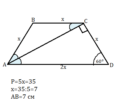 В трапеции ABCD диагональ АС перпендикулярна боковой стороне CD и является биссектрисой угла A. Найдите длину АВ, если периметр трапеции 35 см и угол D=60.