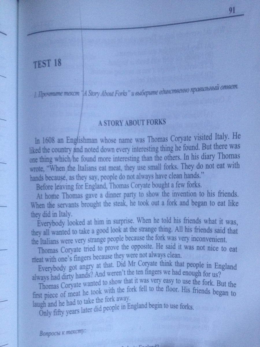 В 1608-м году англичанин, чье имя было Томас Кроет,посетил Италию.Еему понравилось страна и он записывал всё самое интересное что мог найти. Но была одна вещь которую он нашел более интересной чем остальные. В своем дневнике Томас писал:" когда итальянцы едят мясо, они используют маленькие вилочки. Они не едят руками, так как говорят, что у людей не всегда чистые руки. Перед тем как уехать в Англию, Томас купил несколько вилок. Дома Томас устроил обед, чтобы показать изобретение своим друзьям. Когда официанты принесли стэйк, он достал вилку и начал есть как в Италии. Все глядели на него с удивлением. Когда Томас сказал друзьям, что это, они все хотели поближе взглянуть на странную вещицу. Все его друзья сказали, что итальянцы-странный народ, так так вилочка была очень неудобная. Томас попытался доказать им обратное. Он сказал, что неприятно есть мясо руками, так как они не всегда чистые. Все разозлились на это. Неужели Томас думал, что у англичан грязные руки? Неужели ему не достаточно 10 пальцев на руках? Томас хотел показать, что пользоваться вилочкой было просто. Но первый кусок, взятый вилкой, упал на пол. Все стали смеяться, и ему пришлось убрать вилку. Лишь спустя 50 лет англичане начали использовать вилки.