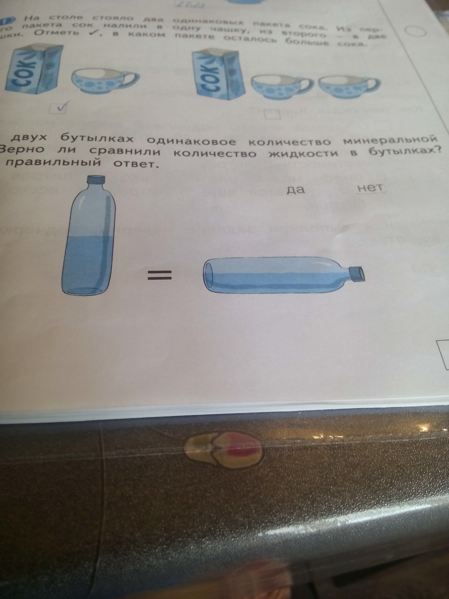 Спасибо. Не мог понять - что хотят: правильно ли, что одинаковое количество воды, или правильно ли измеряют воду в бутылках на рисунке. Еще раз спасибо!!!