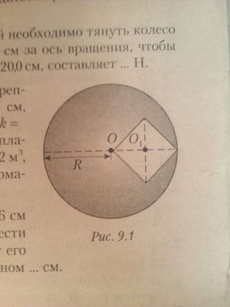 В однородном диске радиусом R=106 см вырезан квадрат. Центр тяжести диска с вырезом будет расположен от его центра на расстоянии x равном... см.