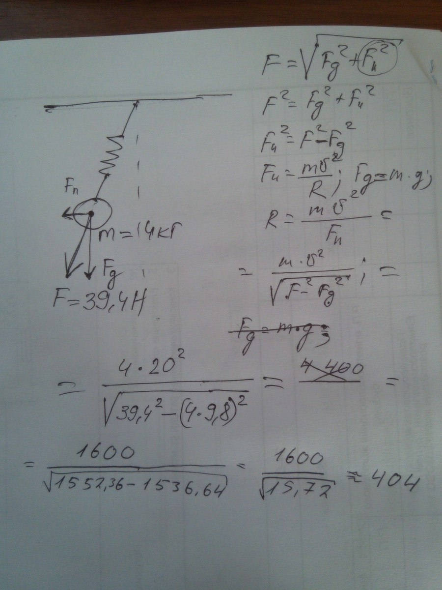 В вагоне поезда, идущего равномерно со скоростью v = 20 м/с по горизонтальному закруглению железнодорожного пути, производится взвешивание груза массой m = 4 кг с помощью динамометра, подвешенного к потолку вагона. Вес Р груза оказался равным 39,4 Н. Определить радиус закругления.