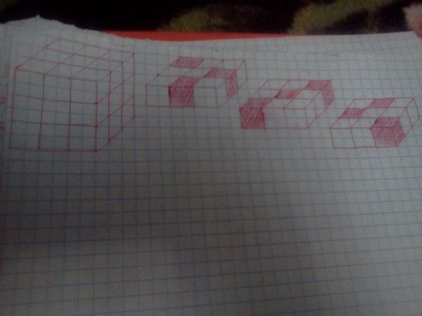 Надеюсь, рисунок понятен) красным заштрихованы кубики, которые необходимо оставить в каждом слое. Тогда полученные 9 кубиков образуют искомую "фигуру".