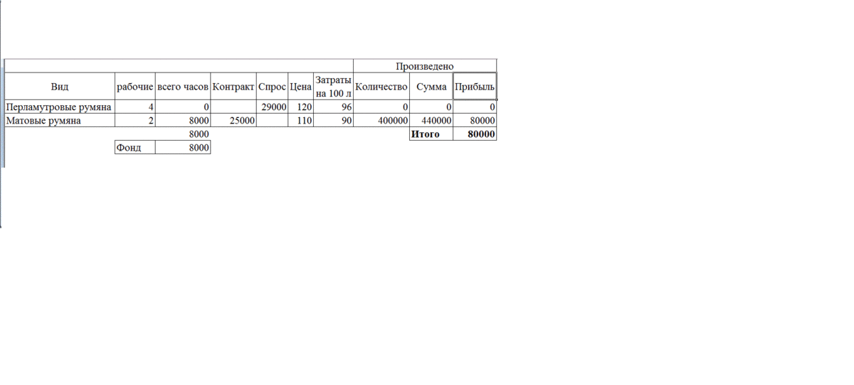 Максимальная прибыль 80000 у.е. при производстве матовых румян, в количестве 400000 л.
