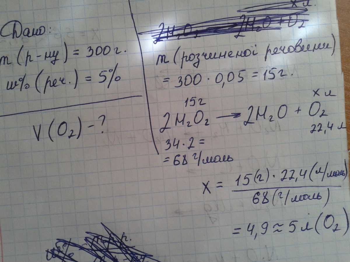 Який об'єм кисню (н.у)виділиться при повному розкладанні гідроген пероксиду, що міститься в 300г його розчину з масовою часткою речовини 5 %?