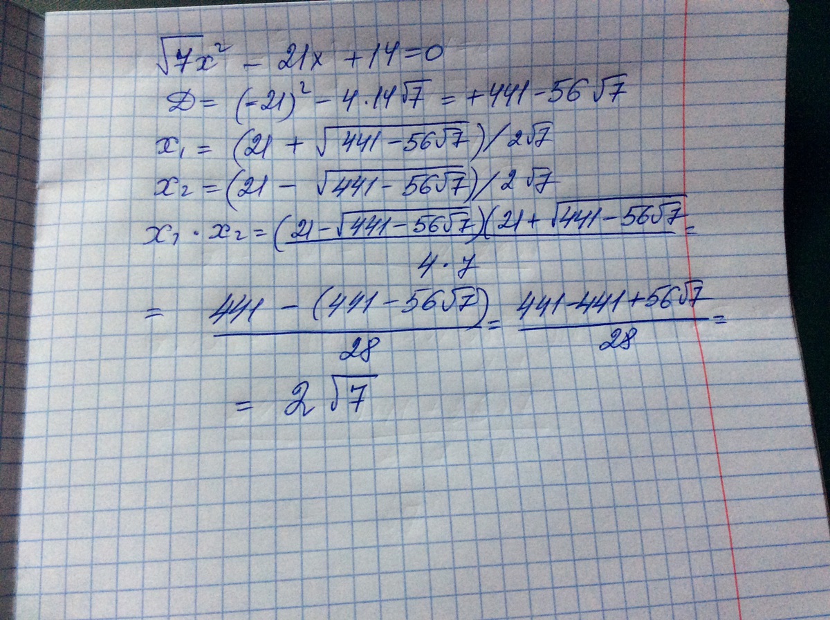 √7x2-21x+14=0 корень из семи на X в квадрате минус 21X +14=0. найти произведение корней