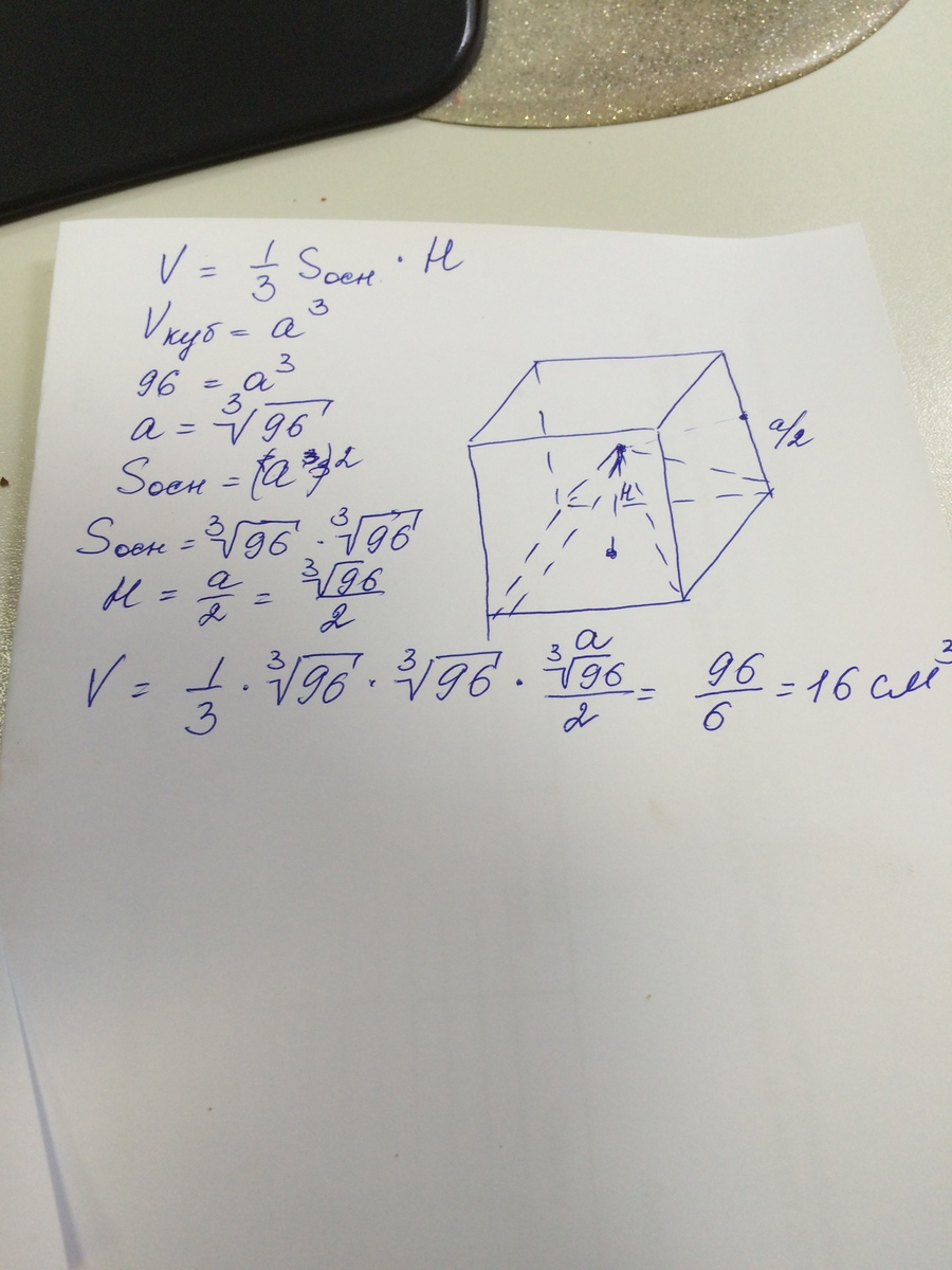 Объем куба равен 96. Найдите объем четырехугольной пирамиды, основанием которой является грань куба, а вершиной — центр куба.