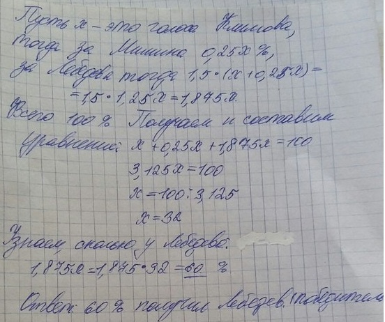 На должность заведующего кафедрой претендовало три кандидата: Климов, Лебедев, Мишин. Во время выборов за Мишина было отдано в 4 раза меньше голосов, чем за Климова, а за Лебедева — в 1,5 раза больше, чем за Климова и Мишина вместе. Сколько процентов голосов получил победитель?