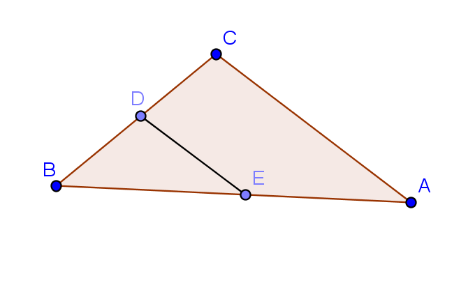 DE - средняя линия, значит треугольники BDE и BCA подобны, коэффициент подобия равен 1:2