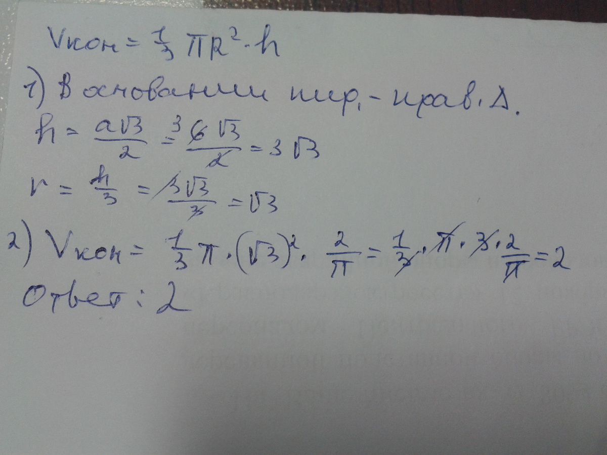 дана правильная треугольная пирамида со стороной основания 6 и высотой 2/П.найдите объем вписанного в пирамиду конуса.