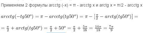 frac{ pi }{2} +arctg(tg50^o)=frac{ pi }{2} +50^o=frac{ pi }{2} +frac{5 pi }{18}=frac{14 pi }{18}=frac{7 pi }{9} arcctg(-tg50^o)= pi -arcctg(tg50^o)= pi -[ frac{ pi }{2} -arctg(tg50^o)]=\ \=