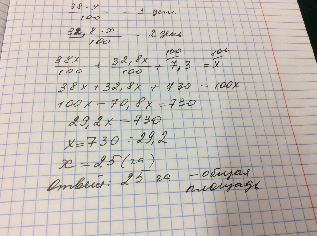 В первый день была произведена посадка леса на 38% всей отведенной площади, во 2ой день-на 32,8%,а в 3ий день на оставшихся 7,3га.Чему равна площадь отведенная под посадку леса?
