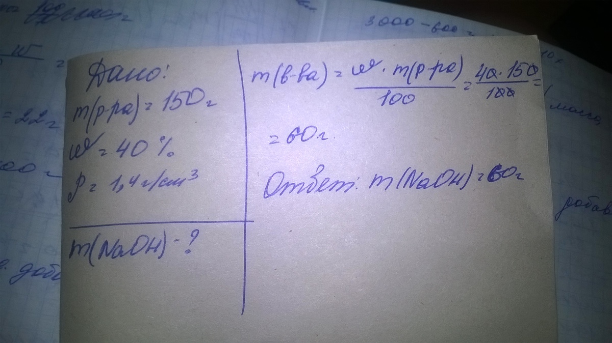 Найдите массу гидроксида натрия в растворе объемом 150 мл с массовой долей 40% и плотностью 1,4 г/см3?