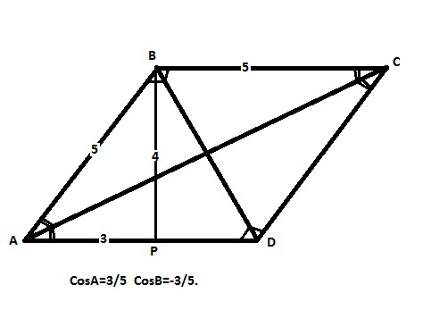 Опустим высоту из тупого угла В на сторону АD. получили Пифагоров треугольник, в котором гипотенуза (сторона ромба) равна 5, катет (высота ромба) равна 4, значит второй катет равен 3. Тогда косинус угла А ромба равен 3/5.