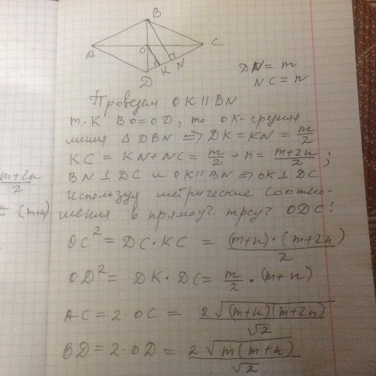 Высота ромба, проведенная из вершины тупого угла, делит его сторону на отрезки длиной m и n. определить диагонали ромба.