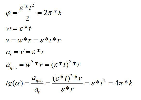 Диск начинает движение из состояния покоя и вращается равномерно-ускоренно. Каким будет угол между векторами скорости и ускорения произвольной точки диска, когда он сделает k оборотов?