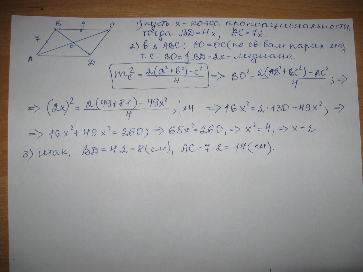 стороны параллелограмма равны 7 см и 9 см, а диагонали относятся как 4:7. найдите диагонали параллелограмма